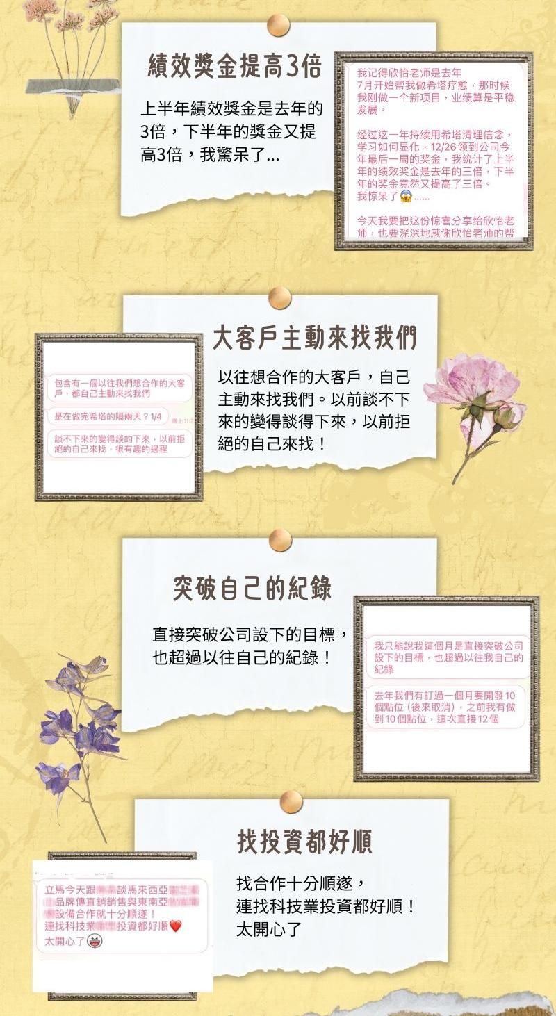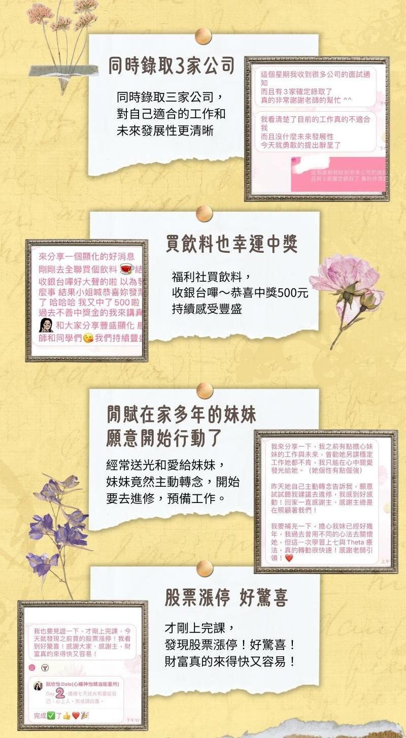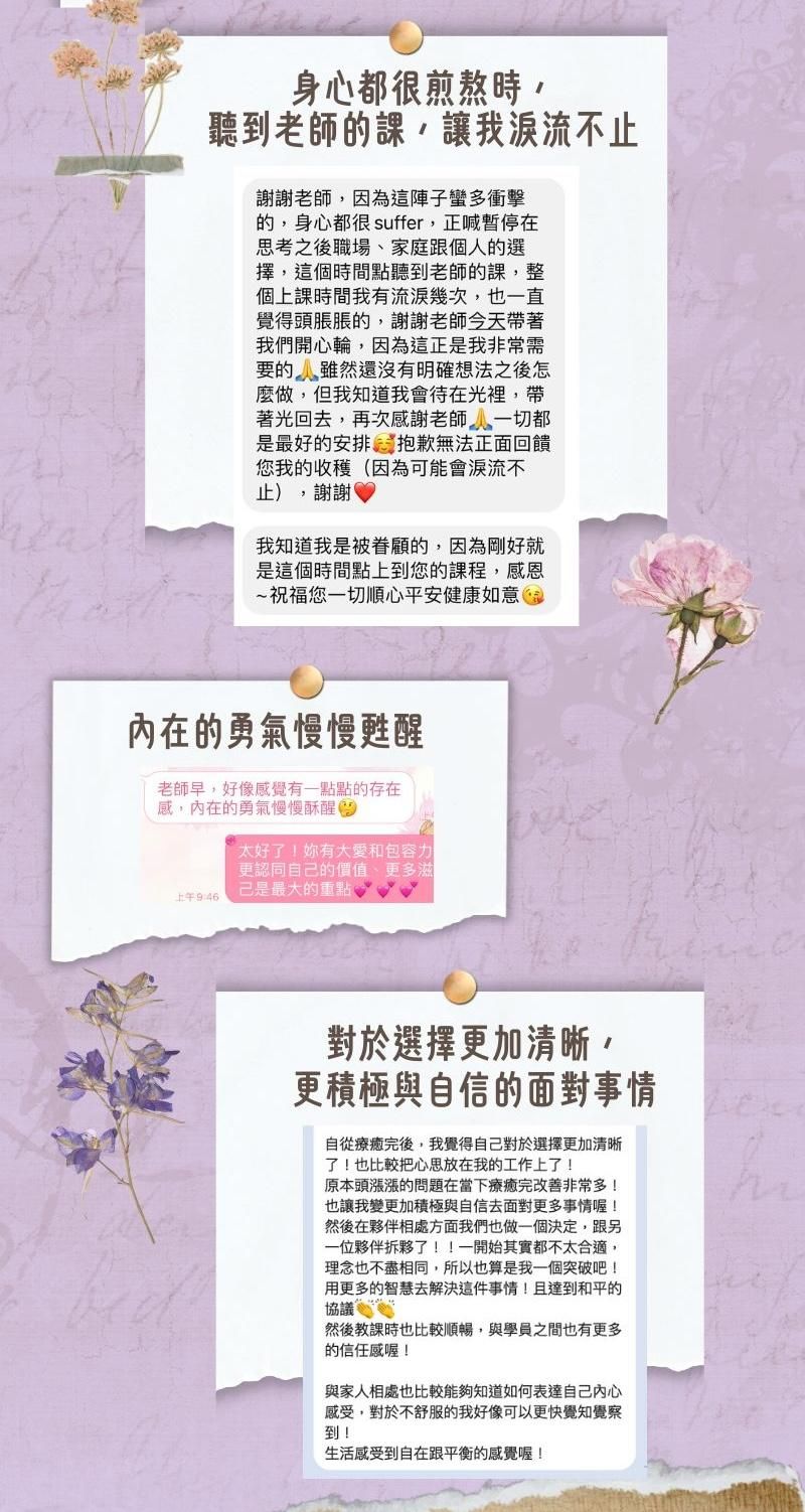 個案見證來自許多方面,包括金錢豐盛、健康、身心情緒、人際親子關係、工作等,很多都產生了巨大的改變。相信這不是僅僅是巧合而已,而是只要你願意,你也能和他們一樣!歡迎預約療癒個案,讓專業的老師來協助你,啟動你自己改變的能量。