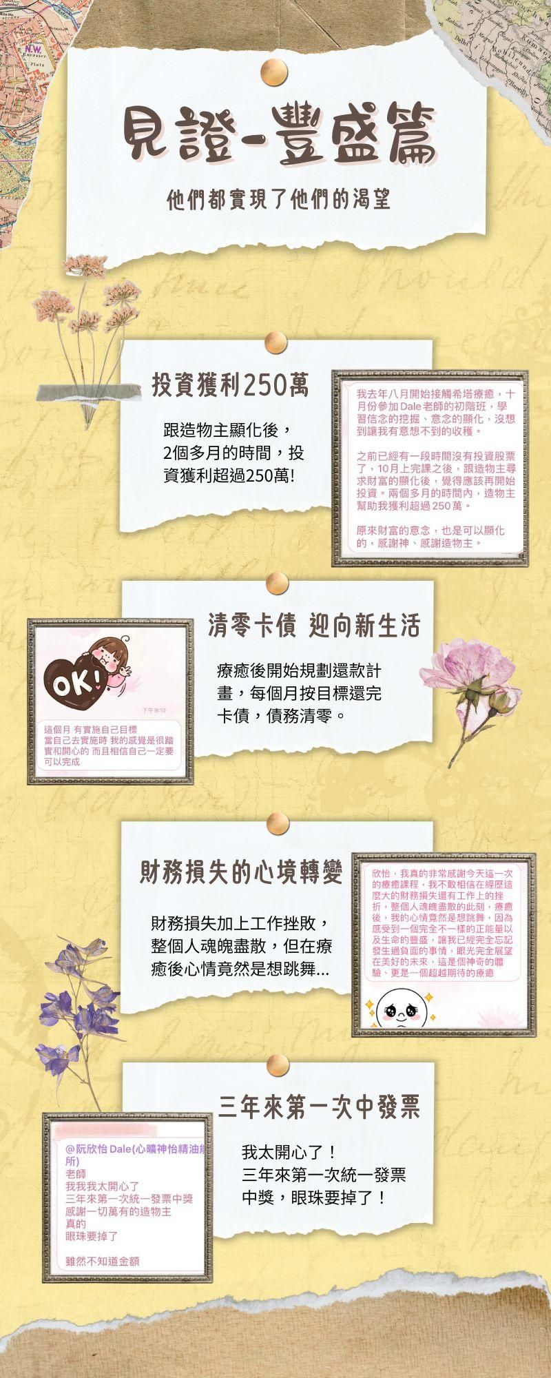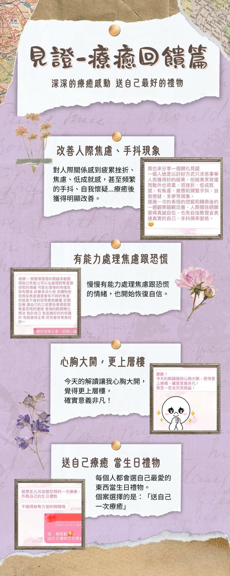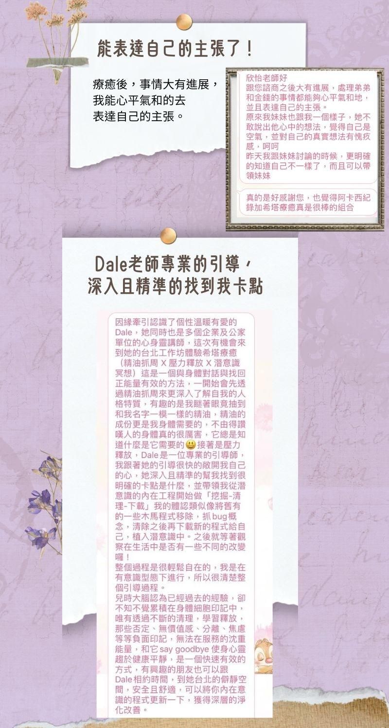 個案見證來自許多方面,包括金錢豐盛、健康、身心情緒、人際親子關係、工作等,很多都產生了巨大的改變。相信這不是僅僅是巧合而已,而是只要你願意,你也能和他們一樣!歡迎預約療癒個案,讓專業的老師來協助你,啟動你自己改變的能量。