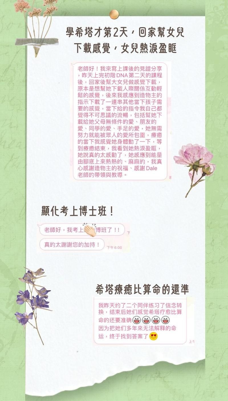 以下是有跟Dale老師學習希塔療癒課程的學生見證,您會發現他們可以廣泛的應用希塔療癒於生活中,過著主動創造理想生活的日子。鼓勵你也來學習,你也能和他們一樣創造自己的理想生活!